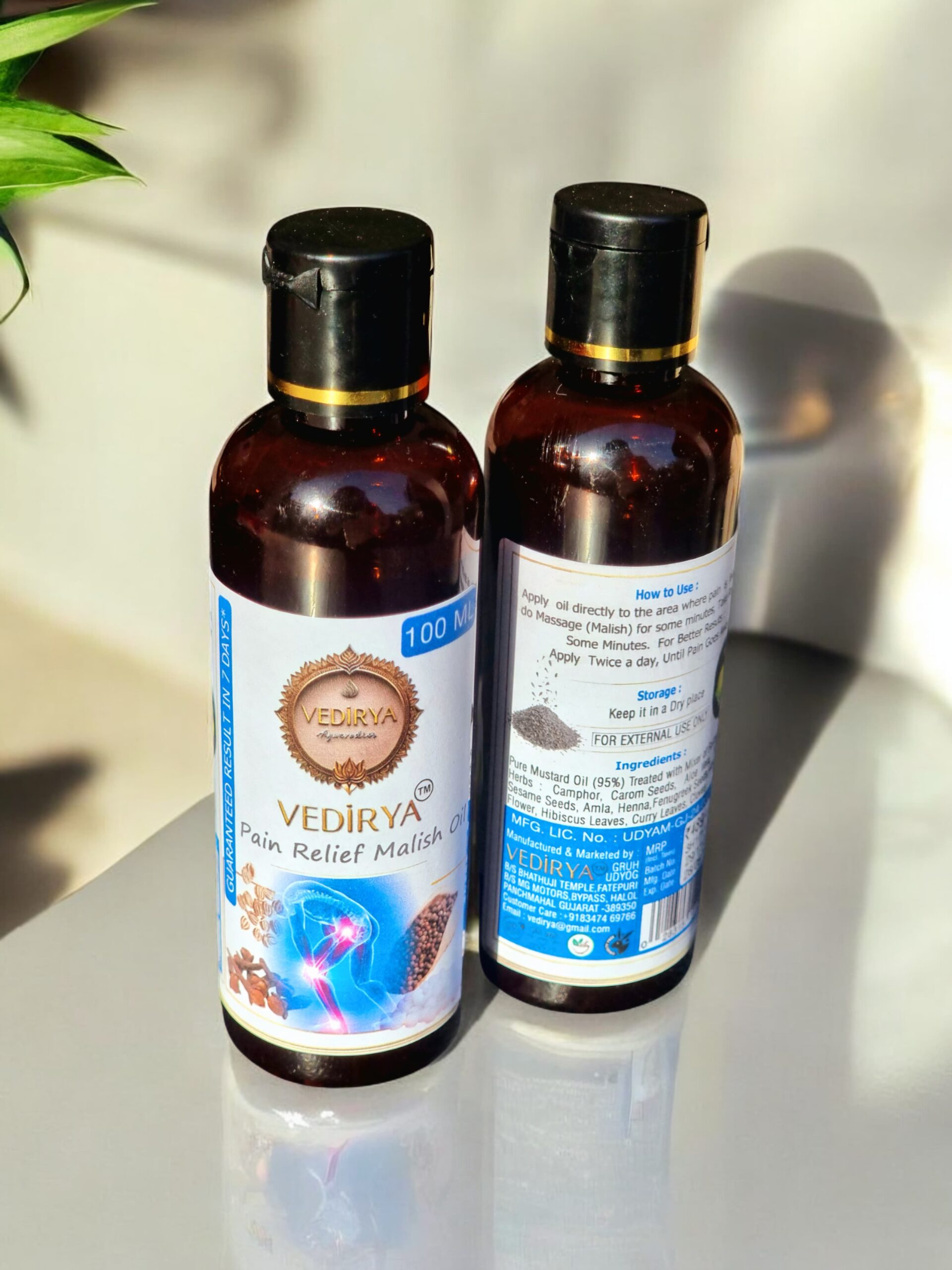 Vedirya Pain Relief Oil is your go-to solution for muscle aches, joint pain, and stress relief.